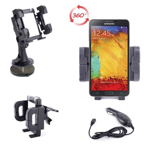 Spesification de produit Support Voiture 3 en 1 pour Smartphone / téléphone portable Samsung Galaxy Note III / Note 3 N9000/N9002 /N9005 - grille d'aération, pare-brise & tableau de bord - Chargeur de voiture allume-cigare BONUS - voir les détails :